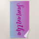 Idéal pour l'été, cette serviette de plage couleur sombre et violet en coton bleu se réalise. Avec un arrière - plan bleu et violet foncé, insérez votre nom dans le modèle en utilisant une police violette colorée. Commandez votre serviette de plage dès aujourd'hui !