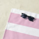 Serviette de plage "Bonjour été" en lettrage à la main et police de style calligraphie avec de mignons tranches de pastèque. La serviette de plage est à rayures roses et blanches. Design de fille. Illustration numérique de Kristine Lee. Pour en savoir plus, visitez le site www.kristineleedesigns.com