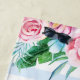 Feuilles de palmiers, monstère, pivoine, roses, autres fleurs tropicales et feuilles formant un beau cadre. OEuvre d'aquarelle claire et saturée. Lettres roses. Bandes bleu clair. Rose, vert, bleu.