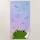 Une mignonne grenouille aux grands yeux regarde à travers une herbe haute et agitée dans un champ sur cette serviette de plage ludique et capricieuse. De jolies libellules de tailles variées volent au-dessus de la tête de la grenouille contre un ciel bleu / rose - personnalisez avec son nom - par katz_d_zynes