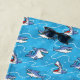 Caricature de grands requins blancs nageant sur un motif de vagues bleues de l'océan. Les amateurs de requins apprécieront ce design amusant sur cette serviette de plage personnalisable !