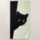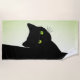Sly chat noir aux yeux vert émeraude regarde de derrière le mur noir dans une pièce verte.