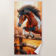 Cette serviette de plage est munie d'un cheval qui saute dessus.