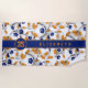 Cette équipe de football colore la serviette de plage pour les garçons ou les filles dispose d'un motif aléatoire de balles de football de taille variée tourné à chaque sens sur un arrière - plan blanc personnalisable - les panneaux typiquement noirs sur chaque balle de football ont été recolorés bleu & orange - personnalisez avec le nom de l'athlète et numéro de maillot - par katz_d_zynes