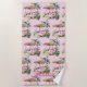 Cette serviette de plage de cabane tropicale rose peut être personnalisée avec un nom et un titre de fête de mariée en cliquant sur "personnaliser ce modèle".
