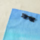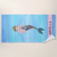 Cette serviette de plage personnalisée a une sirène avec un faux a scintillé queue utilisant une couronne, elle est placée sur des nuances d'océan bleu comme l'arrière - plan.  Personnalisez avec un nom sur le fond.