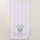 Cette collection preppy présente une illustration verte rétro inspirée de raquettes de tennis sur un fond rayé rose pâle.