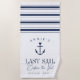Les serviettes de plage assorties pour votre enterrement de vie de jeune fille nautique ou en bateau présentent une illustration d'ancre de navire bleu marine surmontée d'un petit cœur, avec deux lignes de texte personnalisé en dessous; illustré avec "Dernière voile avant le voile". Ajoutez le nom de la mariée incurvé en haut. Les couleurs peuvent être modifiées pour correspondre à vos couleurs préférées à l'aide de l'outil de conception de Zazzle.