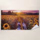 Deux chiens dans un champ de tournesol regardant un coucher de soleil.