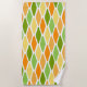 Cette serviette de plage au design moderne du milieu du siècle de diamants aplatis dans les tons jaune, orange et vert.