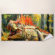 Cette serviette de plage est ornée d'un dinosaure qui y est représenté.