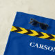Cool bleu modèle de la serviette de plage pour un enfant qui aime les véhicules de construction jaune en noir et jaune. Décor de véhicule amusant pour un petit garçon qui aime les voitures et les camions. Customisez avec le nom de votre enfant sous le ruban de prudence noir et jaune. Comprend un mélangeur de béton et une crevette avec un backhoe.