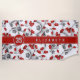 Cette serviette de plage sur le thème du football pour les filles ou les garçons dispose d'un motif aléatoire à l'allure 3D de balles de football de taille variable tournées de chaque côté sur un arrière - plan blanc personnalisable - les panneaux typiquement noirs sur chaque balle de football ont été recolorés rouge & gris - personnalisez avec le nom de l'athlète et le numéro de maillot - par katz_d_zynes