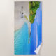 Serviette de plage familiale à thème Tropical personnalisée. Le littoral est sablonneux avec des palmiers et une mer de plage. Personnalisez avec le nom de famille et l'année.