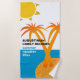 Family Reunion Summer Vacation Beach Towel, avec nom de famille personnalisable et palmiers. Le design montre soleil, palmiers, horizon bleu et plage de parties scintillant dorée, avec une typographie audacieuse. Il suffit de customiser le nom de famille et d'ajouter l'année pour en faire le cadeau parfait de conservation. Obtenez des cadeaux assortis pour toute la famille pour faire de votre prochain voyage un jour férié à retenir.