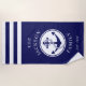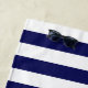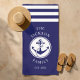 Family Name Nautical Ship Anchor Stripes Beach Towel. Navy blue and white beach towel with personalized family name around an marine themed anchor in the center. Personalize it with your family details and enjoy your summer days at the beach, lake, swimming pool or your back garden.