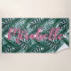 La serviette de plage tropicale personnalisée et élégante présente votre prénom dans une écriture rose vif girly et moderne avec un motif de fond tendance de feuilles de palmier et de monstera vert jungle riche avec un aspect peint à l'aquarelle. La couleur de fond blanc frais peut être modifiée via Personnaliser / Personnaliser davantage. Parfait pour les chaudes journées de plage et de piscine en été.