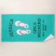 Voyage escapade week-end des filles destination personnalisée Beach Towel. Joli design avec des sandales de plage. Personnalisé avec nom, date et destination tropicale. Elégant modèle de typographie avec conception de tongs de coeur girly. Créez des cadeaux uniques pour les meilleurs amis, invités, demoiselles d'honneur, famille, équipe de mariée, mariée, demoiselles d'honneur, groupes, équipe de mariages, etc. Idéal pour la fête de bachelorette, vacances pour dames, escapade de groupe, soirée amusante etc. bleu turquoise ou couleur personnalisée. Idéal aussi pour la piscine.