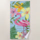 Beau flamant rose en combinaison avec coloré, aquarelle, fleurs tropicales. Luau, adorable, motif rayé, serviette de plage d'été.