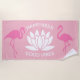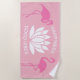 Image Silhouette d'une fleur de lotus, texte blanc Bonheur au-dessus du lotus, et Bonnes vibes sous le plante au centre du produit, deux images silhouettes d'oiseaux flamands roses foncés à gauche et à droite de la fleur, arrière - plan rose. Une serviette de plage unique, belle et personnalisable. Vous pouvez modifier des images et modifier ou supprimer les textes modèles. Amusez-vous et soyez heureux !
