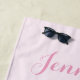 Cette serviette de plage présente l'illustration originale de Destei d'une jolie fleur de frangipanier rose avec deux feuilles verts. La couleur arrière - plan est rose clair avec un motif de sable au fond. En haut il y a une zone de texte personnalisable pour un nom dans une belle police de script.