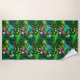 Une Grande Serviette De Plage Colorée Et Verte Avec Palmiers Bleus Et Petites Fleurs Tropicales Blanches