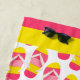Ce design est composé d'un motif fou composé de tongs dénudés. Ces chaussures de plage amusantes, avec leurs rayures roses et jaunes, traversent cette serviette. Les bordures supérieure et inférieure ont des bandes de coordination des couleurs.