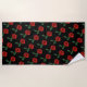 Cette belle serviette de plage fleurie décorative présente un motif répétitif d'une exquise rose rouge écarlate avec trois feuilles verts contre un arrière - plan noir.