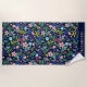 Floral aux feuillages flottants, jolies fleurs stylisées, feuilles, baies, glaces et pois d'accents dans les tons vert, bleu, rose, violet et jaune avec accents orange, rouge et marron. Sur un arrière - plan bleu foncé. Utilisez les modèles pour personnaliser avec votre nom ou message en police rose sur une bande bleue foncée.