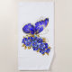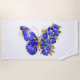 Jewelry, blue, sapphire, sparkling flower butterfly with wing decorated with blue, precious flowers with gold leaves on white background.