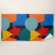 Cette serviette de plage a un design Bauhaus de formes aléatoires en bleu, turquoise, jaune, rouge et orange.