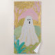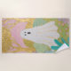 A whimsical and surreal painting featuring a classic, cartoon-like ghost figure—a white sheet with black holes for eyes and an open mouth—centered in a lush, stylized garden or forest setting. The background is dominated by gold leaf and broad, expressive strokes of light pink and gold suggesting trees. The foreground is a dense array of abstract foliage and bushes painted in thick, vibrant colors including lavender, bright green, teal, and blue. The overall aesthetic is naive, dreamlike, and uses a striking combination of flat, folk-art elements and rich, textural embellishment.