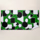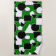 Cette serviette de plage a un design Bauhaus de triangles, cercles, rectangles et pentagons en noir et blanc sur un champ de vert.