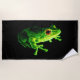 Une serviette de plage amusante avec une grenouille verte fractalisée aux yeux orange contrastés sur un arrière - plan noir.