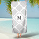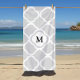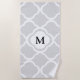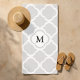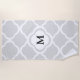Serviette de plage grise avec un motif quatrefeuilles marocain blanc et un monogramme personnalisé au centre.