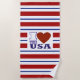 Cette serviette de plage spacieuse est ornée du logo "I Heart The USA", sur un arrière - plan de rayures patriotiques rouge, blanc et bleu.