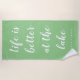 La vie est meilleure au lac personnalisé vert Beach Towel. Cool écriture de script de brosse à lettres imprimées à la main typographie pour une citation humoristique. Des idées cadeaux uniques pour lui. Bleu clair ou couleur arrière - plan personnalisée. Grande taille pour plage ou piscine. Créez vos propres serviettes extra-larges pour les meilleurs amis, retraités, retraités, pensionnés, famille, mari, femme, collègue, patron amusant, employé, maman, papa, soeur, frère, tante, oncle, grand-père, grand-mère, manager, enseignant, infirmière, coéquipier, employé de bureau, nageur, voyageur, couple etc. Grand modèle de texte de lettre. Elégant lettrage à la main calligraphie avec de jolies lettres tourbillonnant. Personnalisez avec son nom en bas.