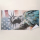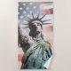 La Statue de la Liberté avec le drapeau américain derrière elle.