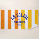 La serviette de plage Côte d'Azur est parfaite pour votre escapade... rayures de cabane orange et jaune avec lettrage bleu vif "Le Soleil Vacances". Personnalisez avec les détails de vos vacances ensoleillées... année et destination. Idéal pour un voyage à la plage en famille ou entre amis ou pour une bachelorette de destination ou comme souvenir pour un voyage passé. Accessoires correspondants disponibles dans la Collection Cabana Le Soleil Vacances Côte d'Azur Cabana.