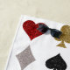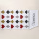 Cette serviette de plage personnalisée dispose d'un poker ou casino jouant aux cartes thème avec les symboles pour les différents costumes. Les coeurs sont imprimés en rouge, les clubs en or, les pique en noir, et les diamants en argent. Les images sont imprimées dans un motif carrelé à travers le tapis. Un nom d'exemple est imprimé en bas. Vous pouvez personnaliser la serviette pour inclure votre propre nom personnalisé ou autre texte.
