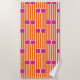 Cette serviette de plage présente un design moderne du milieu du siècle de lignes verticales orange avec des rectangles roses au-dessus, répétées sur le design.