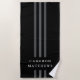 Serviette de plage avec trois lignes gris foncé courant de haut en bas et votre nom en travers.
