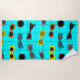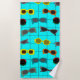 Cette serviette de plage a un design moderne du milieu du siècle de lunettes de soleil rétro sur un champ de bleu avec une grille.