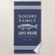 serviette bleu marine de la maison du lac avec une image rustique de truite et une typographie serif audacieuse. Personnalisez ce design avec votre nom de famille et votre année. Customisez davantage cette conception en sélectionnant le lien "customiser plus loin" si vous le souhaitez.