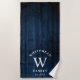 Ce design rustique a un arrière - plan en bois bleu marine et monogramme familial.