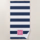 Preppy chic monogrammed serviette de plage en rose et marine dispose de larges bandes bleu marine et blanc classique, avec votre unique monogramme initial centré au fond dans vibrante, rose bonbon d'été.