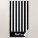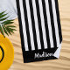 Créez votre propre serviette de plage personnalisée avec un script élégant personnalisé nom monogramme et motif motif rayé en noir et blanc.