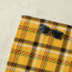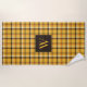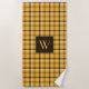 Serviette de plage monogrammée avec un motif carré beige marron et un monogramme beige personnalisé dans un rectangle marron foncé au centre.