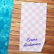 Serviette de plage avec votre nom en bleu une police de style rétro sur un motif en damier rose pâle et blanc.