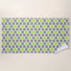 La serviette de plage moderne est ornée d'un motif hexagone géométrique de 3 couleurs : blanc, gris et vert citron.
